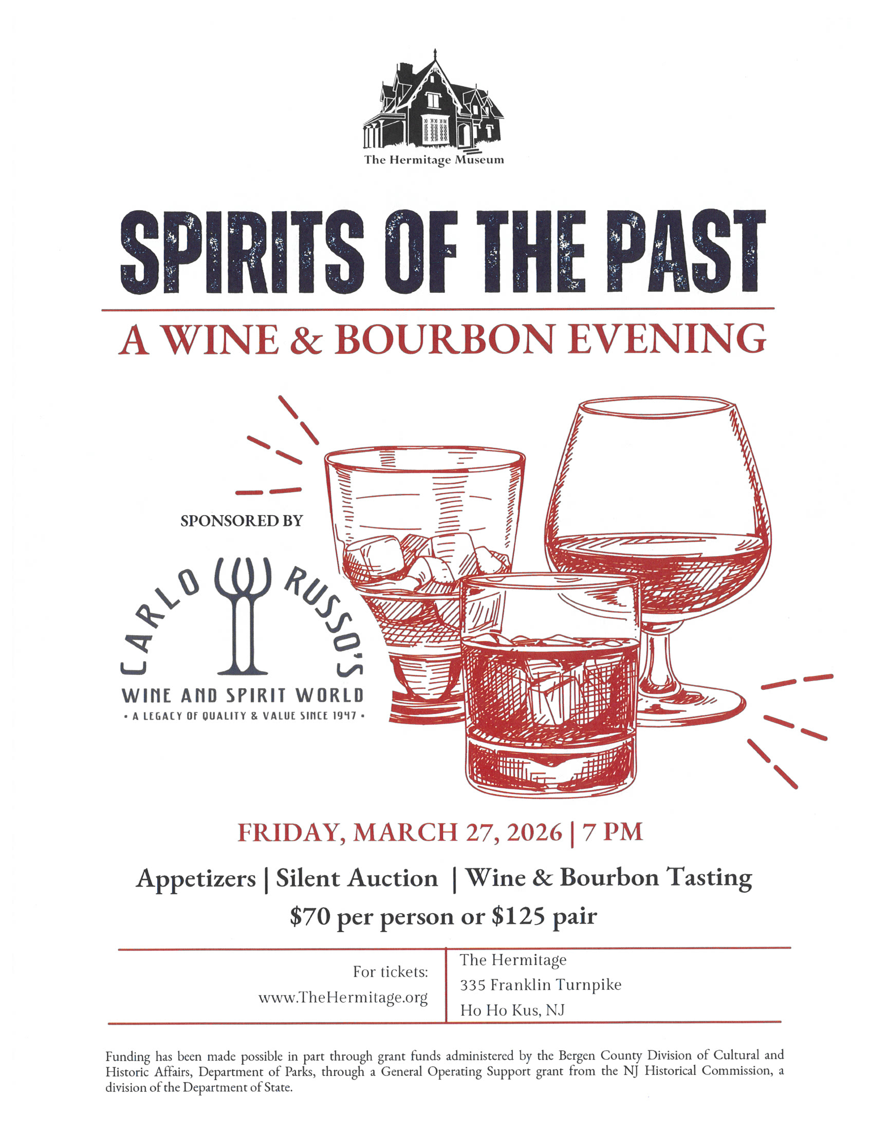 Taste wines and bourbons from Carlo Russo's Wine and spirit World, while dabbling in the history of The Hermitage. Appetizers and a silent auction will add to the fun!